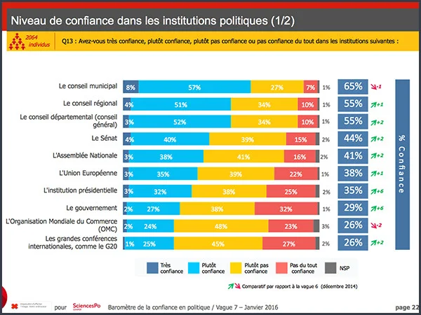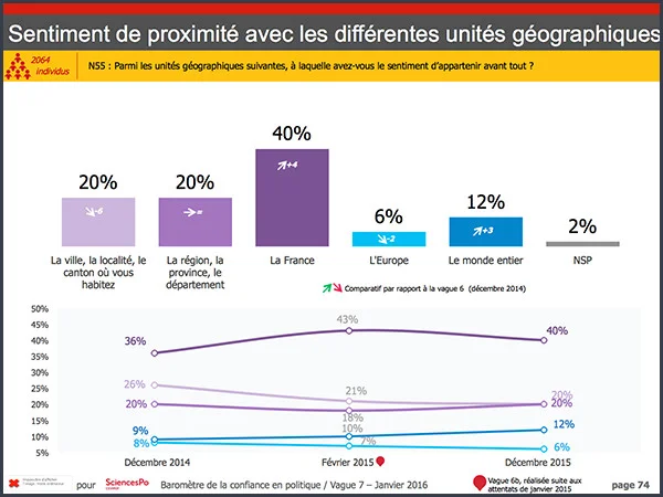 Le Baromètre existe en effet depuis 2009, année au cours de laquelle eurent d’ailleurs lieu des élections européennes. Il prend le pouls, annuellement, d’un échantillon représentatif de Français pour évaluer leur confiance politique, qui est une valeur cardinale de notre vie démocratique. En décembre 2015, lors de la 7ème vague du Baromètre, on a constaté que les Français expriment une confiance modérée à l’endroit de l’Union européenne, une institution considérée comme éloignée.