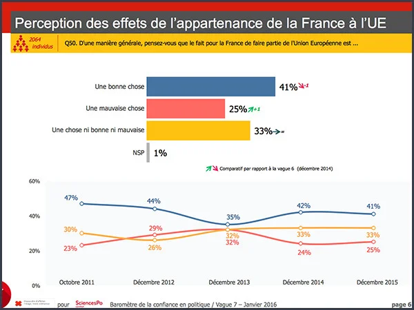 Oui et non. Pour 41% des personnes interrogées en décembre 2015, faire partie de l’Union Européenne est « une bonne chose » pour la France. Cependant si on additionne les euro-sceptiques (25% estiment qu’il s’agit d’une mauvaise chose) et les euro-indifférents (33% penchent qu’il s’agit d’une chose ni bonne ni mauvaise), on perçoit que cette perception positive n’est plus majoritaire.