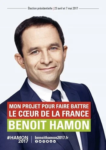 L’affiche de Benoit Hamon étonne, en ce qu’elle semble moins ancrée dans les compositions du Parti Socialistes… que dans celles du Front de Gauche! On retrouve notamment l’utilisation de cadres rouge vif et du vert, qui faisait la marque de Jean-Luc Mélenchon durant la campagne de 2012. On retrouve bien ici l’importance, pour Benoit Hamon, de rappeler à la fois son ancrage à la gauche du Parti Socialiste, et son alliance avec les écologistes.