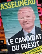 Il s’agit, de fait, de la réalisation la plus ancienne. Elle reprend en effet la photo et la composition utilisées sur les affiches que François Asselineau, depuis plus d’un an, fait placarder dans les rues de nombreuses villes de France. Une manière assez habile de légitimer sa candidature, en rappelant qu’il mène campagne depuis longtemps déjà.