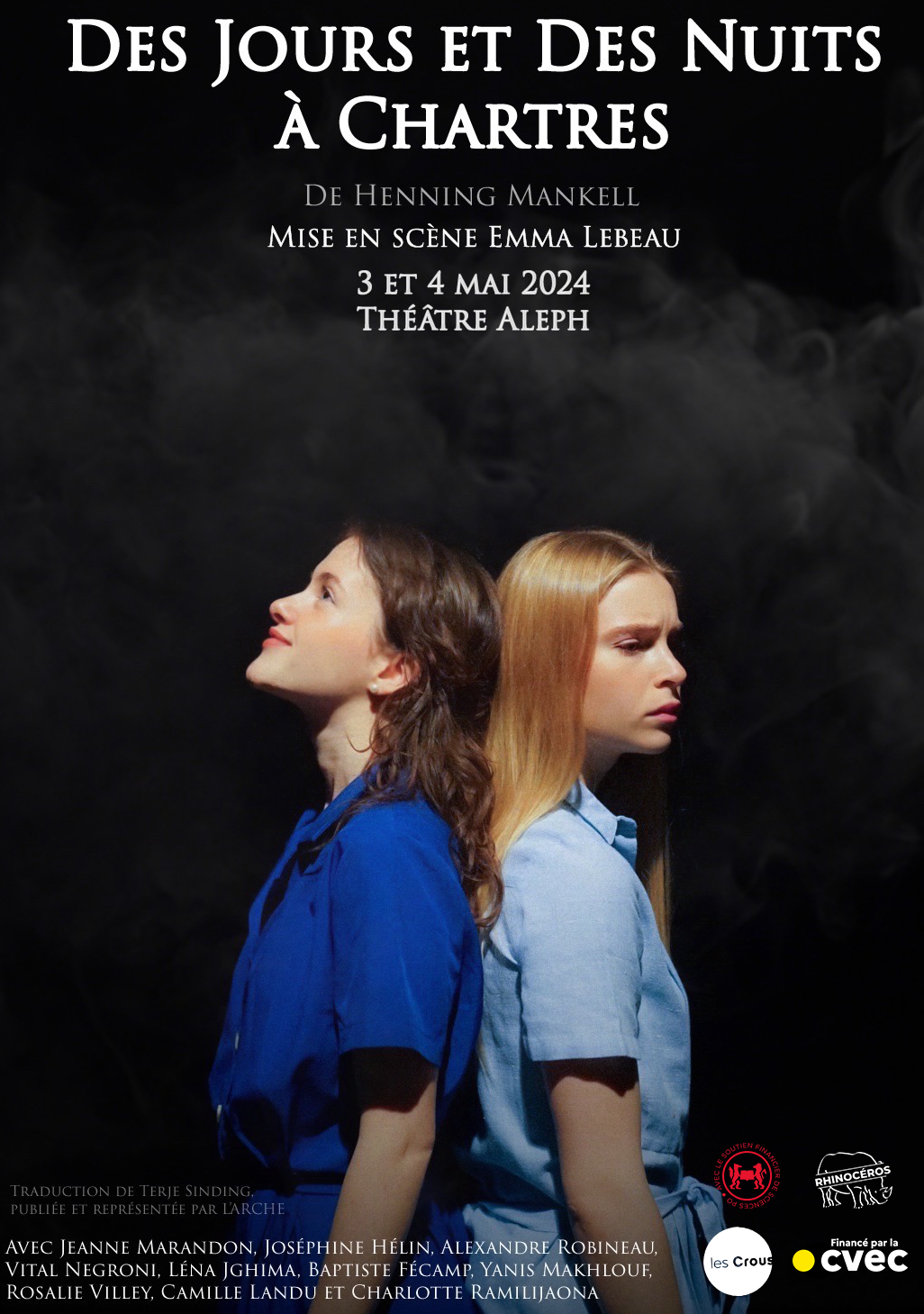 Après avoir toujours joué, je désirai mettre en scène et donner vie à ma vision artistique d’une pièce, être « de l’autre côté » du plateau, dans le cadre du Festiféros, festival de théâtre de l’association Rhinocéros de Sciences Po. Dans ce cadre, mon choix s’est porté sur Des jours et des nuits à Chartres d’Henning Mankell, publiée en 2011.